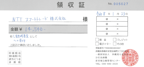 2024年12月1日~2025年11月30日までの首里城公園・首里城基金 受領証